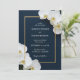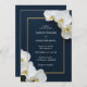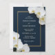 Invitation vos êtres chers pour célébrer votre mariage avec cette élégante et moderne faire-part de mariage personnalisée. De délicieuses fleurs d'orchidées blanches mettent magnifiquement en valeur vos noms, sur un fond de marine sophistiqué encadré d'une subtile bordure dorée. Customisez avec tous vos détails mariages essentiels pour un faire-part intemporel.