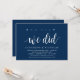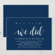Carte d'invitation sur le thème Moderne Rustique, Écriture Bleu Marine (avec titre de carte : oh oui, nous l'avons fait). Elle est parfaite pour votre réception de mariage en fuite / fête de célébration post-mariage. Ajoutez vos détails dans une police / lettrage noir assorti.