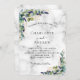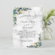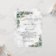 Marbre imprimé comme arrière - plan décoré de verdure d'eucalyptus et de feuillage doré. Personnalisez et ajoutez vos noms et les détails du mariage. Lettres noires.
