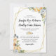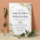 Faire-part de mariage rustique élégant avec un fond blanc uni qui peut être changé en n'importe quelle couleur, un cadre géométrique doré, des fleurs d'eau aquarelle pêche et chardon bleu/gris, et un modèle de mariage moderne.