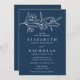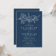 Élégantes invitations à un mariage floral avec des fleurs blanches esquissées et des feuilles près du sommet de l'invitation avec un arrière - plan de la marine. Personnalisez la faire-part de mariage botanique avec vos noms et les détails mariages ci-dessous en lettres blanches classiques. Conçu pour coordonner avec notre collection de mariages floraux esquissés.