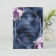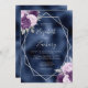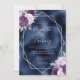 Cet élégant faire-part de mariage moderne présente un cadre géométrique argenté décoré de bouquets de fleurs lilas, violet et argenté sur un arrière - plan bleu marine en faux feuille. Le texte personnalisable combine écriture fantaisie gris argenté, cuivre et polices italiques.