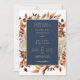 Faire-part de mariage floral de la chute de la marine. Cette élégante invitation de mariage présente de belles aquarelles peintes à la main feuilles d'orange et de terre cuite, dahlias crème et beige, et de beaux roses rouille et marron sur un arrière - plan blanc, parfait pour un mariage d'automne! Le dos de l'invitation a une belle branche de feuilles avec le monogramme de la mariée et du marié. Trouvez les articles correspondants dans la collection de Mariages de la Marine bleue d'automne romance.