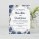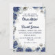 Ce design faire-part de mariage présente une bordure fleurie élégante de roses bleu foncé et des fleurs délicates, accentuées de détails argentés et dorés. Cet arrangement entoure un centre blanc élégant, parfait pour le texte. La combinaison des couleurs bleu foncé argent et or et des feuilles délicats crée une touche intemporelle et sophistiquée. Un agencement floral assorti est ajouté à l'arrière pour reprendre le thème général.