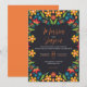 Cette Faire-part de mariage de fleurs botaniques colorées mexicaines présente une bordure fleurie vibrante composée de fleurs orange, rouge, jaune et bleue, entrecoupées de feuilles et de tiges verts et animés. La disposition symétrique encadre un espace blanc central, idéal pour le texte, et donne à la composition globale une apparence structurée et festive. Le style d'illustration plat et épuré et les couleurs vives et saturées évoquent une esthétique joyeuse d'inspiration folk, adaptée aux occasions festives comme les mariages.