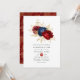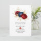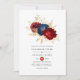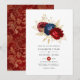 Faire-part de mariage floral couleur rouge pourpre et bleu marine avec feuillage doré faux feuillage et damas en velours vintage inverse.