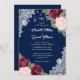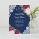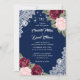 Elégante faire-part de mariage rustique bleu marine, bordeaux et rousse avec de belles fleurs d'aquarelle contre un burlap et arrière - plan dentelle décoré de lampes à cordes. Les détails du mariage sont écrits dans une police de script design.
