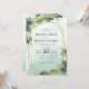 Cartes d'invitation de mariage à l'eucalyptus avec un fond délavé à l'aquarelle rustique, une forme géométrique pailletée d'or, des feuilles botaniques vertes élégantes, des éclaboussures de faux foil doré et un modèle de mariage simple à personnaliser.