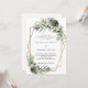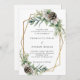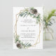 Pour un mariage d'hiver. Un arrière - plan blanc décoré de cônes, de baies blanches et de verdure. Un cadre géométrique en faux or. Personnalisez et ajoutez vos noms et détails.