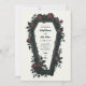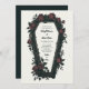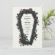 Belle et sombre, cette faire-part de mariage de cercueil est parfaite pour un mariage gothique ou d'Halloween. Le café a des roses autour des bords. La typographie calligraphique à la main ajoute à l'aspect. Voir la coordination des articles dans notre boutique, Enchanted Finch.