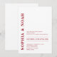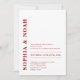 Cette invitation présente un arrière - plan blanc sophistiqué au design minimaliste. Les noms du couple sont mis en évidence par une typographie audacieuse et élégante en rouge, ajoutant une touche d'élégance moderne à l'invitation.