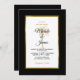 Invitation vos invités pour vous aider à célébrer votre journée spéciale avec cette élégante invitation avec script moderne, texte noir et or y compris un palmier artistique et cadre or métallique sur le devant de la carte. Un arrière - plan noir est à l'avant et à l'arrière.