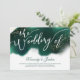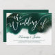 Invitation de mariage moderne et élégante avec une palette de couleurs vert émeraude et or tendance. Il y a un design à l'ombre aquarelle avec une parties scintillant en faux or. Il y a un script blanc écrit à la main qui dit "le mariage de". Customisez ce produit en ajoutant les informations de votre mariage ci-dessous. Cette couleur verte profonde est parfaite pour un mariage d'automne ou d'hiver.