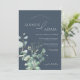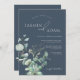 Notre simple Royal Blue Opulence Eucalyptus Feuille Green Foliage Faire-part de mariage capture l'essence de la beauté botanique et le charme rustique. Doté de feuilles d'eucalyptus délicats et d'une verdure élégante, sur un arrière - plan royal bleu opulence, ce design avec son élégant monogramme des initiales du couple, est parfait pour votre mariage d'inspiration boho. Le motif de feuillage ajoute une touche d’élégance à la nature, créant un cadre serein et sophistiqué pour votre journée spéciale.