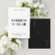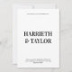 Ce faire-part de mariage présente un design épuré et minimaliste avec une typographie audacieuse et centrée, utilisant de grandes polices de serif pour les noms du couple et un texte majuscule plus petit pour les détails de l'événement, le tout contre un arrière - plan blanc simple. Le dos a un arrière - plan noir avec 2 monogramme initial.