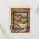 Faire-part de mariage en bois de mariage campagnard rustique avec bottes occidentales, brindilles en bois, cadres en forme de coeur pour vos noms et roue de wagon avec chaussure en argent.