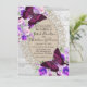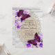 Ces magnifiques faire-part de mariage en bois blanc et dentelle présentent des papillons, des fleurs violettes et des roses crème rose. Parfait pour un mariage champêtre rustique ou pour une célébration de mariage DIY. Très élégant.