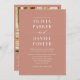 Annoncez votre journée spéciale avec ce faire-part de mariage en terre cuite boho moderne, doté d'un agencement propre et minimaliste qui présente magnifiquement votre photo et un code QR pratique pour l'accès RSVP ou site Web. Les tons chauds de terre cuite et les accents bohèmes subtils créent une esthétique intemporelle et naturelle, parfaite pour les mariages du désert, rustiques ou extérieurs avec une ambiance détendue mais élégante.