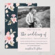 Jolie faire-part de mariage fleurie blanche, aux motifs floraux bleus et roses chic, dans un style vintage rétro, avec une photo.