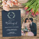 Elégant faire-part de mariage photo botanique monogrammé d'aquarelle pour les mariages du printemps, de l'été, de l'automne ou d'hiver. Aquarelle à branche d'olivier verte sur carte bleue marine. Vous pouvez facilement modifier le texte et ajouter votre propre photo.