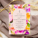 Faire-part de mariage photo florale de couleur gras avec rose, violet, jaune, vert et vert foncé et fleurs abstraites et une forme géométrique arrondie sur rose pastel, arrondie et rose pâle, ajouter votre photo à l'arrière. Parfait pour les mariages de toute saison.
