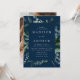 Invitations de mariage élégantes avec vos détails mariages nichés dans un cadre rectangulaire entouré d'eucalyptus, fougères et autres riches verdure sur un arrière - plan de marine. Les invitations de mariage botanique modernes s'inversent pour afficher votre photo verticale à fond de sang. Conçu pour coordonner avec notre collection de mariages de verdure Abondante.