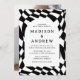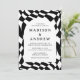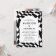 Invités Invitations pour fêter votre journée spéciale avec des invitations de mariage retro Retro Black and White Checkerboard photo! L'invitation affiche vos noms et vos détails mariages en lettres noires entourées d'un cadre en arc blanc. L'arrière - plan dispose d'un motif abstrait en damier avec un jeu de couleurs noir et blanc. L'invitation s'inverse pour afficher votre photo de fiançailles vertical à fond de sang.