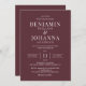 Invitation de mariage classique et élégante avec un arrière - plan rouge marron et des lettres blanches. Conception uniquement textuelle avec un libellé traditionnel. Options de papier imprimé numérique ou physique. Personnalisez-le avec les noms de M. et Mme, l'emplacement du lieu, le registre, les informations RSVP et tous les détails que vous devez inclure. Produits de suite correspondants disponibles.