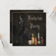 Cartons d'invitation élégants, drôles et cools pour enterrement de vie de garçon sur le thème gothique avec un squelette horrible et génial futur marié, habillé d'un chapeau melon noir ou d'un haut-de-forme et d'un smoking, avec une canne élégante pointant vers des bouteilles d'alcool de champagne et de whisky à côté de lui appelées Virus Zombie, Fantôme Liquide, Poison pour Rats, Jus d'Embaumement et Vieux Venin d'Araignée. Le fond est un collage sombre shabby chic grunge avec des volutes et des fioritures élégantes. Invitations drôles, chics et tendance pour les goths ou pour Halloween. Tout le texte peut être facilement personnalisé pour répondre à vos besoins et vous pouvez changer le style, la couleur et la taille de la police si vous le souhaitez. Si vous avez besoin d'aide pour personnaliser