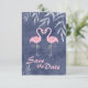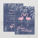 Jolis Flamants Roses sur un Fond de Plage Tropicale Bleu Foncé Grunge Enregistrer les Faire-Part de Mariage.