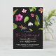 Cette invitation de mariage à destination sur une belle plage tropicale présente des éléments floraux élégants à l'aquarelle en rose, jaune, bleu et blanc, un perroquet tropical et de la verdure sur fond noir ainsi qu'un lettrage manuscrit rose tendance. Facile à personnaliser avec vos propres informations de mariage. C'est parfait pour un mariage à la plage, tropical, exotique ou de destination à Hawaii, en Floride, au Mexique, dans les Caraïbes ou en Amérique centrale ou du Sud.
