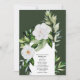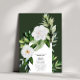 Illustration d'aquarelle de fleurs blanches au design botanique tourbillonnant autour d'un rectangle blanc avec du texte. Arrière - plan vert foncé.