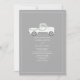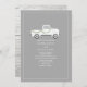 Faire-part de mariage illustrant un camion vintage blanc décoré de végétation fleurie blanche. Le Arrière - plan est gris avec du texte blanc et une bordure à rayures. L'image inverse est faite de briques blanches.