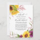 Des tournesols boho rustiques et des dahlias en ligne longue distance virtuel cérémonie mariage invitation dans des teintes de prune bordeaux et des couleurs du soleil.