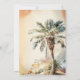 Elégante invitation de mariage aquarelle dans des tons vintages moody avec un grand palmier, signe et lunettes de soleil.
