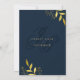 Un monogramme chic avec élégantes invitations à mariage florales feuilles d'or et bleu marine. Cette simple faire-part de mariage de feuillage d'or géométrique est parfaite pour toute fille sophistiquée. Ce design est idéal pour un événement de fête branché et élégant. Customisez cette conception avec votre message et des informations personnalisées. Tous les dessins sont imprimés.