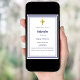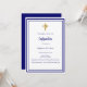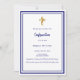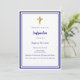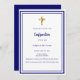 Un arrière - plan blanc, décoré d'un cadre bleu marine, et une croix dorée Personnalisez et ajoutez le nom et les détails. Texte bleu.