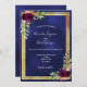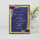Une faire-part de mariage moderne et tendance. Un arrière - plan bleu foncé, bleu marine. La couleur bleue est inégale. Avec un cadre en faux or et des fleurs bordeaux aquarelles, des fleurs verdoyantes. Modèles pour vos noms et informations de cérémonie. Les noms sont écrits avec un script de style moderne écrit à la main. Retour : arrière - plan bleu.