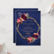 Une faire-part de mariage rustique de style champêtre. Un cadre géométrique en faux or avec plumes et fleurs aquarellées en or bordeaux, rose et rose. Personnalisez et ajoutez vos prénoms et les détails du mariage. Un mur de grange en bois rustique bleu marine foncé en arrière - plan. Lettres d'or. Dos : mur de grange en bois bleu rustique comme arrière - plan.