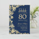 Invitation à la fête du 80e anniversaire de la Marine bleu or floral surprise. Design élégant avec des roses, fausse feuille d'or et police de script de typographie. Carte invitation tendance parfaite pour une célébration anniversaire élégante. Peut être customisé à n'importe quel âge. Invitations Zazzle imprimées ou téléchargement instantané modèle imprimable numérique.