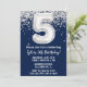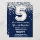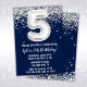 Marine bleu et argent 5e anniversaire invitation à la fête d'âge 5 anniversaire invitation à la fête d'anniversaire avec parties scintillant et écriture de script moderne et ballons de papier amusant.