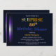 Une surprise moderne bleu profond à 80e anniversaire invitation dîner avec indigo vibrant à bandes violettes sur le côté gauche de l'invitation et le mot SURPRISE et l'âge en or. Une invitation entièrement personnalisable qui est disponible en plusieurs types de papier allant du lin à l'argent métallique. Les options d'impression par défaut sont standard mais peuvent être imprimées en haute définition pour une vibration supplémentaire des couleurs.