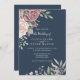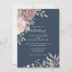 Un design d'aquarelle élégant de grands roses dans les tons rose clair sur un arrière - plan bleu marine. Le dos de la carte a un petit arrangement floral au centre. Vous pouvez ajouter des détails dans le menu "modifier la conception". Cette invitation fait partie d'une belle suite de mariage assortie qui peut être entièrement personnalisée.