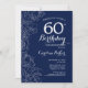 Navy White Floral 60th Birthday Party Invitation. Design moderne minimaliste avec accents de dessin botanique et police de script de typographie. Carte invitation simple et tendance, parfaite pour une célébration anniversaire élégante. Peut être customisé à n'importe quel âge. Invitations Zazzle imprimées ou téléchargement instantané modèle imprimable numérique.