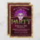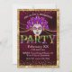 Cette invitation personnalisée présente un thème glamour de la mascarade Mardi Gras sur un arrière - plan de couleur bordeaux, texture feuille. Un masque est représenté au centre avec des perles Mardi Gras violettes, dorées et vertes collées de chaque côté. Un cadre de paillettes d'or borde l'invitation et les diamants de la parties scintillant d'or sont aspergés de confettis le long des parties supérieure et inférieure.