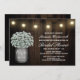 Mason Jar Baby's Breath Bridal Shower Invitations - design dispose d'un arrière - plan en bois de grange avec des lampes à cordes au sommet avec un bouquet du souffle de Baby's à l'intérieur d'un bocal de maçon avec le mot amour imprimé dans une police élégante.