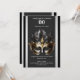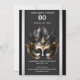 Une belle aquarelle graphique d'un masque fae argent au charbon et faux or orné de plumes gris foncé. Le masque facial est défini sur un arrière - plan noir bordé de lignes verticales faux argentées qui entourent des modèles de texte gris pâle pour votre libellé personnalisé. Elles sont idéales pour une mascarade, une boule masquée, un masque d'anniversaire ou une fête festive.