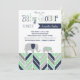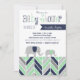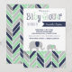 Cette invitation fraîche et moderne de baby shower comporte un motif multicolore géométrique de chevron dans le bleu marine, le vert de menthe, et les tons du gris. Inclut également un contact de fantaisie avec deux éléphants de bébé marchant le long. Perfectionnez pour un baby shower de garçon.