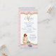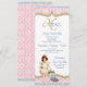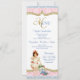 Menu de fête d'anniversaire vintage avec une jolie fille victorienne sur un joli fond damassé rose et bleu. Ce menu de goûter rose, bleu et or est facilement personnalisable pour votre événement en ajoutant simplement vos détails dans le style de police et la couleur de votre choix. Il s'agit d'un design imprimé sans véritable paillette.
