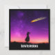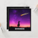 Une invitation avec un thème pour une fête de fin post-apocalyptique à partir d'une douche météorologique. Le design a un ciel violet vif et coloré dans la soirée crépusculaire avec une couverture d'étoiles recouvrant le ciel. Une silhouette d'une fille debout sur une colline, regardant haut dans le ciel, tandis qu'une boule de feu de météorite brillante se dirige vers la terre sur le point de s'écraser.